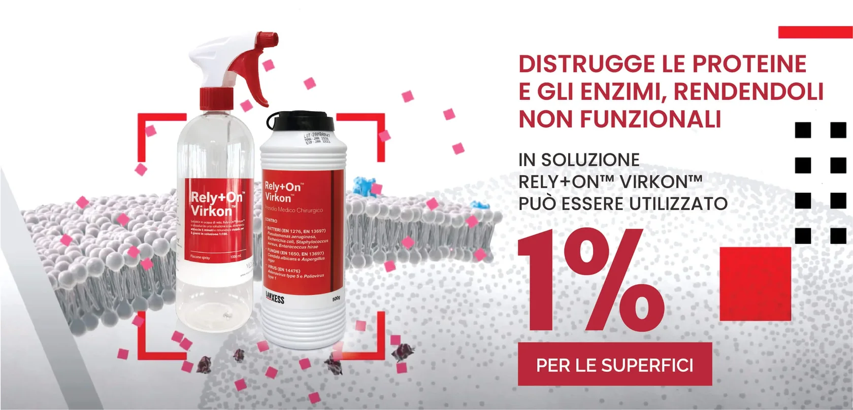 Rely+On™ Virkon™ utilizza un’azione ossidativa avanzata, attaccando batteri, spore e virus in modo irreversibile. Il disinfettante penetra nella membrana cellulare e danneggia le strutture critiche del microrganismo, disattivando proteine ed enzimi essenziali alla sua sopravvivenza. Questo processo porta alla completa distruzione del patogeno.